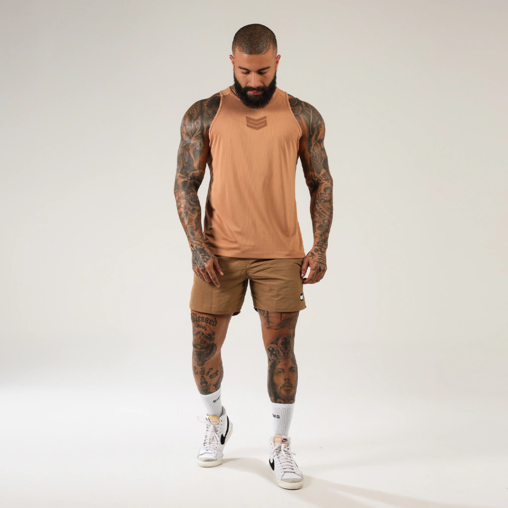 Caramelo com silk sobretom frontal da logo da Sieg Sports e silk sobretom traseiro com frase "Conquer your Victory".